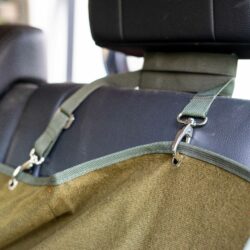 Car seat cover with dirt-repellent CORDURA fabric and insulating micro fleece at the bottom. Attached with belts and clips.