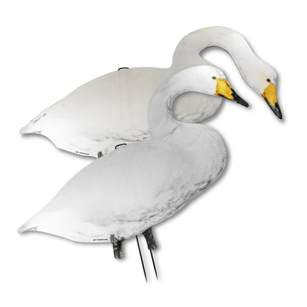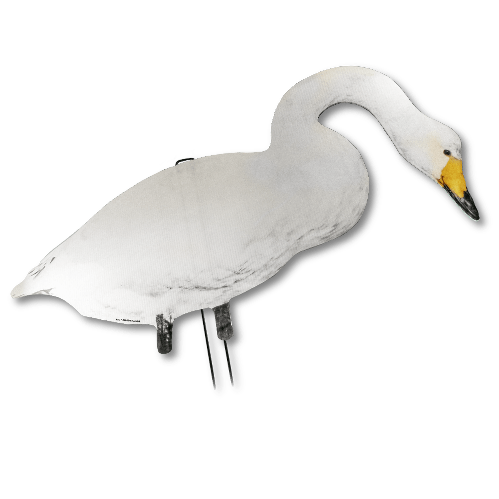 Place the Big Al’s silhouettes in a varied setup along with full body decoys, shells and Sillosocks. This is a very effective way to blur your blind, as the geese will be focused on the number of swans and geese that have landed in the field to eat.