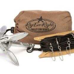 In all its simplicity you mount four decoys on the main line with the enclosed swivels with hook. The anchor is mounted at the opposite end and placed as far from the blind or barge that you find necessary.